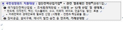 ±¹¹Î¼ºÀåÆÝµå´Â ÷´ÜÀü·«»ê¾÷°ú °ü·Ã »ýŰè Àü¹ÝÀ» Áö¿øÇϱâ À§ÇØ 5³â°£ ¹Î°ü ÇÕµ¿À¸·Î ÃÑ 150Á¶ ¿ø ±Ô¸ð·Î Á¶¼ºµÇ´Â Á¤ºÎÀÇ ÇÙ½É ±ÝÀ¶Á¤Ã¥ÀÌ´Ù. Áö¿ø ´ë»óÀº ¹ÝµµÃ¼¡¤¹æ»ê¡¤ÀΰøÁö´É¡¤·Îº¿ µî 12°³ ±¹°¡Ã·´ÜÀü·«»ê¾÷°ú ÀÌ¿¡ ÇÊ¿äÇÑ Àåºñ °ø±Þ, ¼³ºñ ±¸Ãà µî ¹ë·ùüÀÎ Àü¹ÝÀ» Æ÷ÇÔÇÑ´Ù.