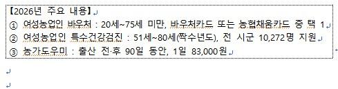 ´ë»óÀº µµ³» ³óÃÌÁö¿ª¿¡ °ÅÁÖÇÏ¸ç ³ó¾÷°æ¿µÃ¼¿¡ µî·ÏµÈ ¸¸ 20¼¼ ÀÌ»ó 75¼¼ ¹Ì¸¸ ¿©¼º³ó¾÷ÀÎÀÌ´Ù. ¿ÃÇØºÎÅÍ´Â ³óÇù Àü¿ë ¹Ù¿ìó Ä«µå ¹ß±Þ ¶Ç´Â ±âÁ¸ ä¿òÄ«µå Æ÷ÀÎÆ® ¹æ½Ä Áß ¼±ÅÃÇÒ ¼ö ÀÖµµ·Ï °³¼±µÆ´Ù. Áö¿ø±ÝÀº °Ç°°ü¸®¿Í ¹®È¡¤¿©°¡ Ȱµ¿ µî ´Ù¾çÇÑ ºÐ¾ß¿¡ »ç¿ëÇÒ ¼ö ÀÖÀ¸¸ç, »ç¿ë±âÇÑÀº 2026³â 12¿ù 31ÀϱîÁö´Ù.