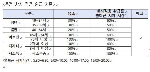 ¿ì¼± 4¿ù 1ÀϺÎÅÍ 6°³¿ù°£ ½ÃÂ÷ ÃâÅð±Ù* ½Ã°£´ë(¿ÀÀü 5½Ã 30ºÐ~6½Ã 30ºÐ, 9½Ã~10½Ã / ¿ÀÈÄ 4½Ã~5½Ã, 7½Ã~8½Ã)¿¡ ´ëÁß±³ÅëÀ» ÀÌ¿ëÇÏ¸é ¡®ÄÉÀÌ(K)-ÆÐ½º¡¯ ȯ±Þ·üÀÌ ±âÁ¸ ´ëºñ ÃÖ´ë 30%p »óÇâ Àû¿ëµÈ´Ù. ÀÌ¿¡ µû¶ó ÀÏ¹Ý 50%, û³â¡¤¾î¸£½Å¡¤´ÙÀÚ³à ºÎ¸ð 60%, 3ÀÚ³à ÀÌ»ó ºÎ¸ð 80% ¼öÁرîÁö ȯ±Þ¹ÞÀ» ¼ö ÀÖ´Ù. Àú¼ÒµæÃþ°ú 75¼¼ ÀÌ»ó ¾î¸£½ÅÀº ½ÃÂ÷ ÃâÅð±Ù ½Ã°£´ë¿Í »ó°ü¾øÀÌ °æ³²ÆÐ½º·Î 100% ȯ±ÞµÈ´Ù.